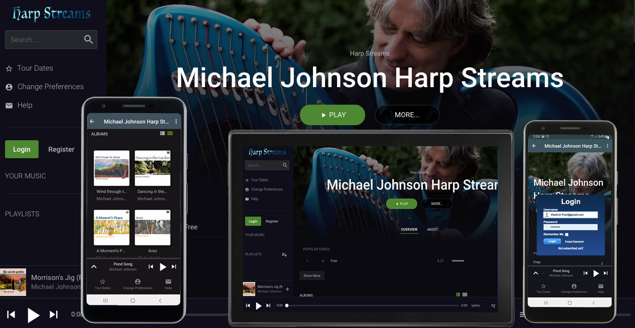 Harp Streams is a platform to showcase the compositions of harpist and composer, Michael Johnson. Most of these pieces have been inspired by elements of the natural world and celebrate life on earth through the portals on music, in particular, the music of the harp. This site provides access to the music streaming App, the music shop, harp meditations and concerts.